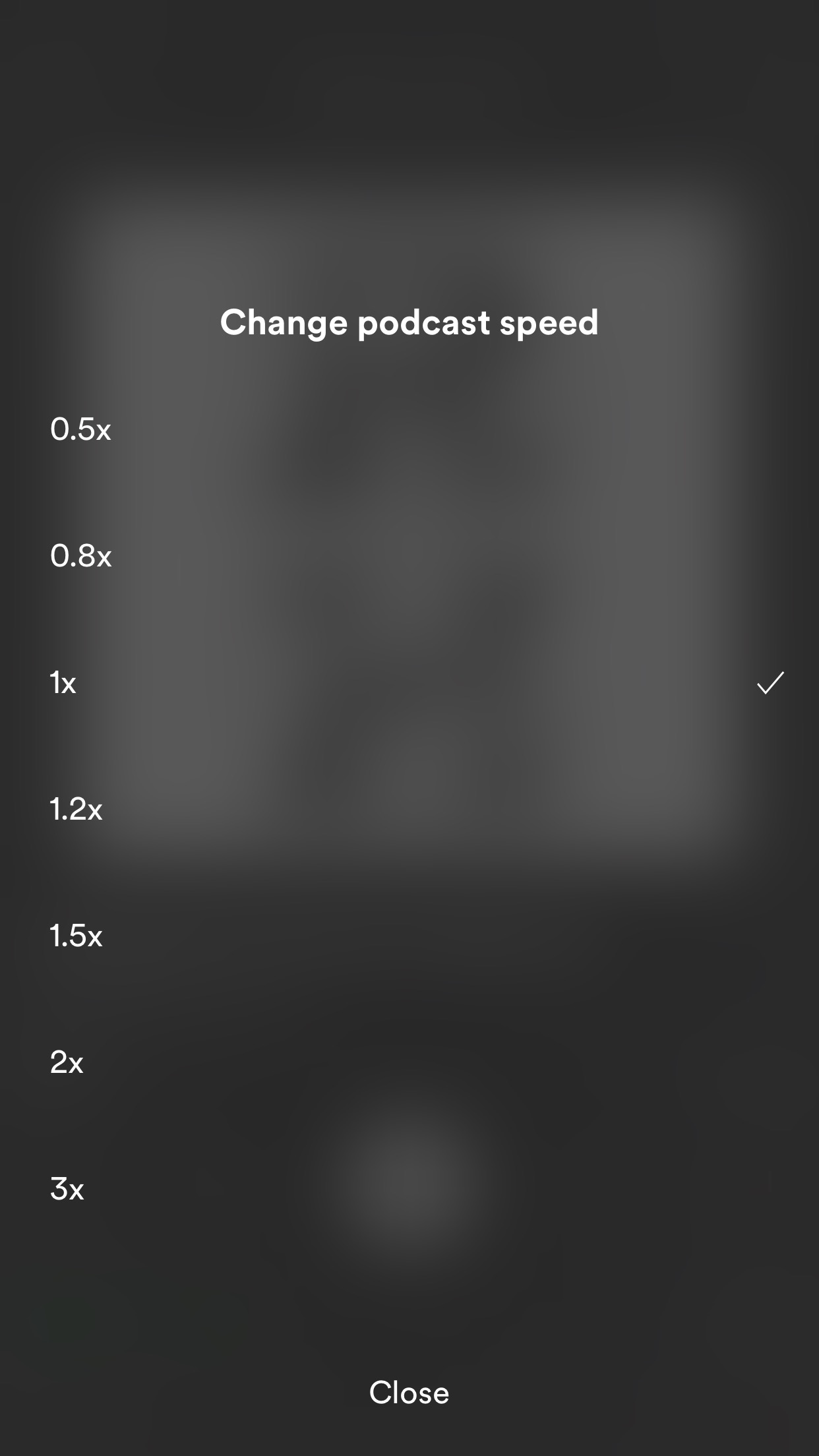 Below see the options to listen to podcasts at speeds from 0.5 – 3x. Spotify limits this feature to podcasts, but it has a wider range, going up to 3x, which is greater than most audio platforms.