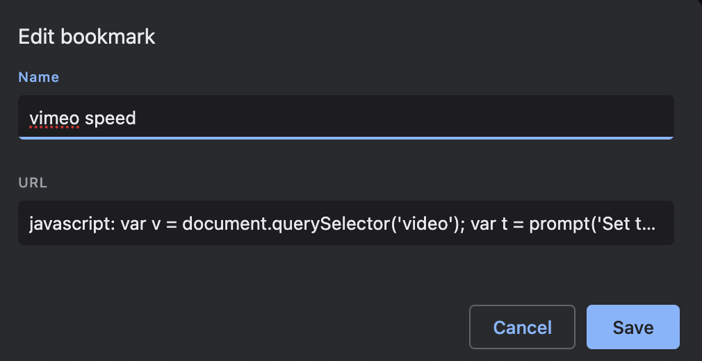 Now, when you use the bookmark you can specify any speed you’d like. This works on Vimeo and YouTube. No longer are you limited to not being able to change the video speed on Vimeo AT ALL (outrageous), but you can also break the limit of 2x on YouTube as well.