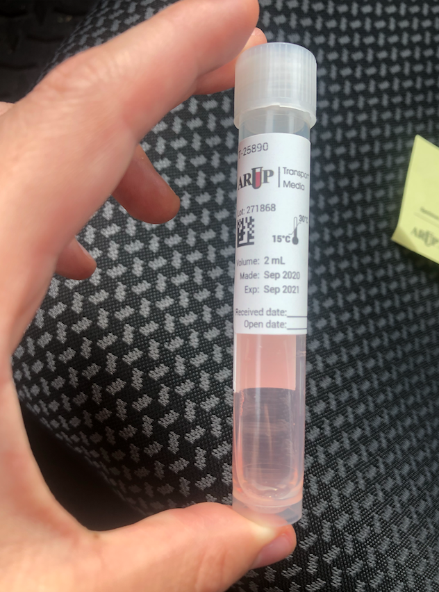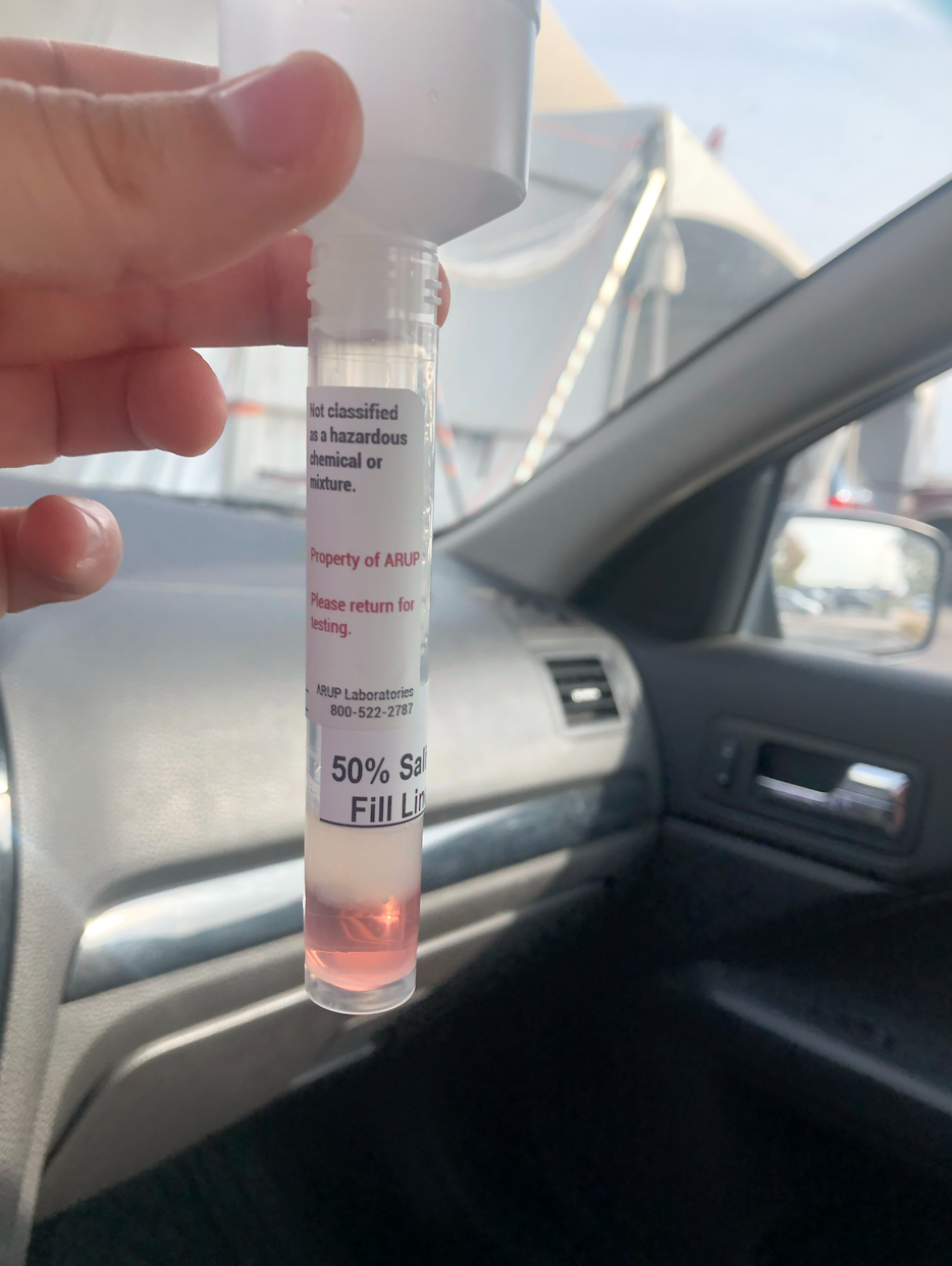 I drove to the testing location, waited in line, and after verifying my identity was handed a plastic bag with a bottle of pink liquid, a funnel, some printed out instructions, and asked if I had eaten or drunk anything in the past 5 minutes.